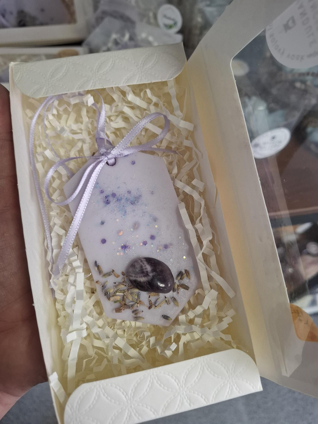 Sójový vonný vosk ve tvaru kosodélníku zdobený ametystem. Je tu pro Vaše chvíle pohody a relaxace, pročistí Vaše myšlenky a uklidní mysl. Vosk s krásnou a dlouhotrvající vůní s čistým esenciálním olejem.